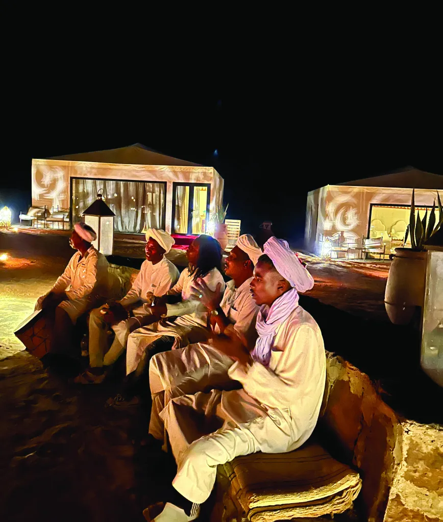 Merzouga Luxury Desert Camp, Erg Chebbi kum tepelerinin ortasında, boşlukta tek başına konumlanmış 15 çadırdan oluşan bir çöl kampı. Kamp ve çadır sözcükleri sizi yanıltmasın, geniş çadırların içi lüks bir otel odasından farksız, her türlü konforunuz düşünülmüş. Kampın ortasında yer alan büyük bir ateş çevresinde sıralanmış ve mumlarla aydınlatılmış yemek masaları ise yıldızlar altında unutulmaz bir gece geçirmeniz için tasarlanmış. Ateş başında yenen akşam yemeğine zaman zaman yerel bir Gnawa müzik grubu da eşlik ediyor. Gnawa adı verilen, dini tınılarla folk ritimlerini birleştiren bu müzik türü son dönemde uluslararası müzik çevrelerinin ilgisini çekiyor. Hatta Fas’ın Atlantik Okyanusu kıyısında yer alan sahil